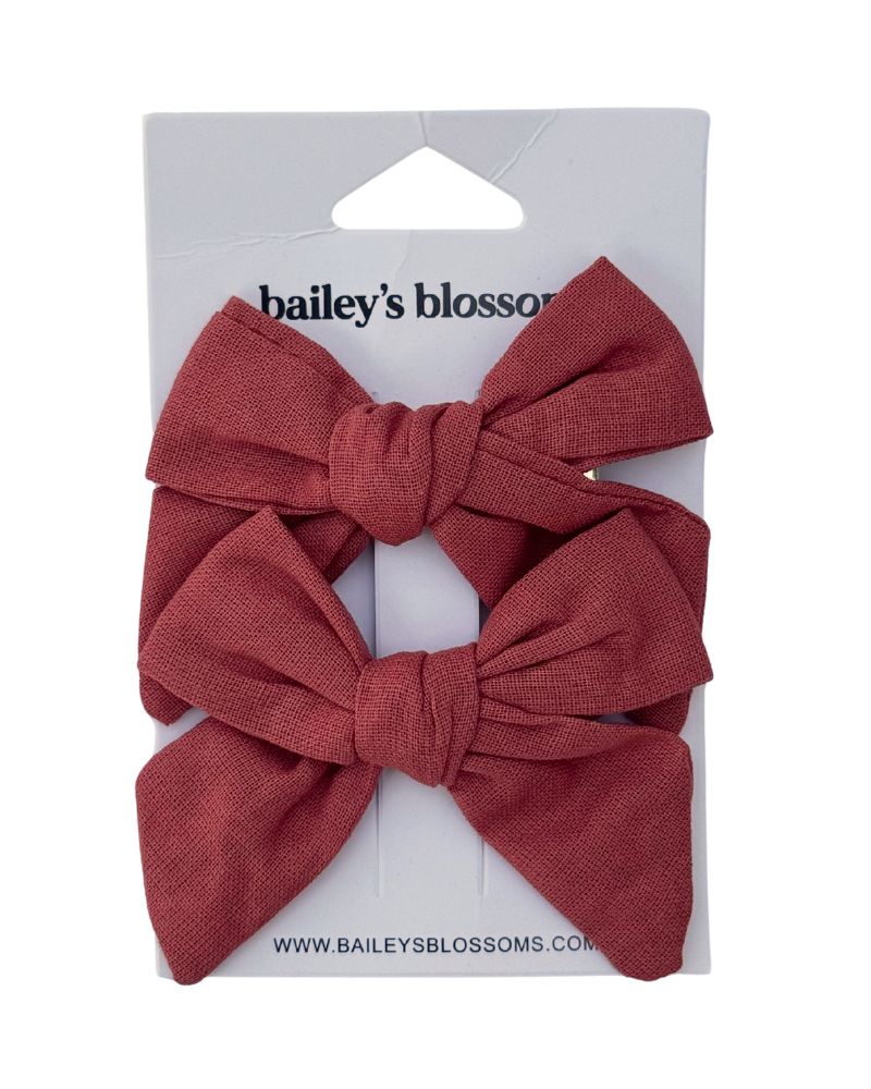 Warm, earthy, and full of charm! The Piggie Set Hair Clips in Rust add the perfect autumn-inspired touch to any hairstyle. Made from a soft linen-cotton blend, these bows are securely attached to alligator clips for a comfy, no-slip hold. Whether styled with pigtails, ponytails, or worn as a cozy accent, these rust-colored clips bring a timeless and versatile finish to your little one’s look.