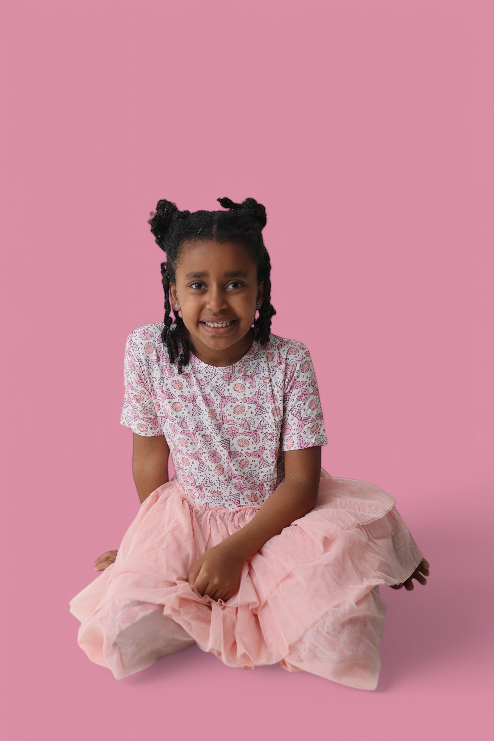 - Whimsical mermaid print with tails, shells, and stars in dreamy pink tones