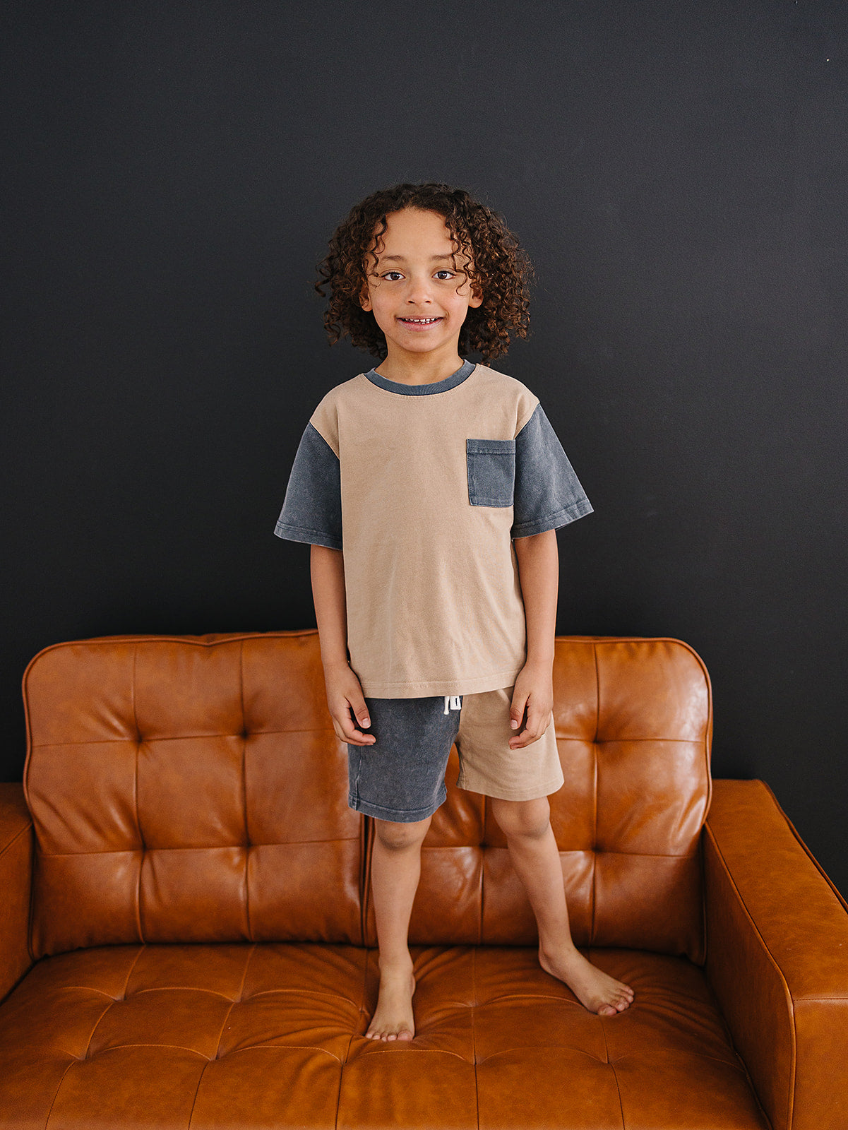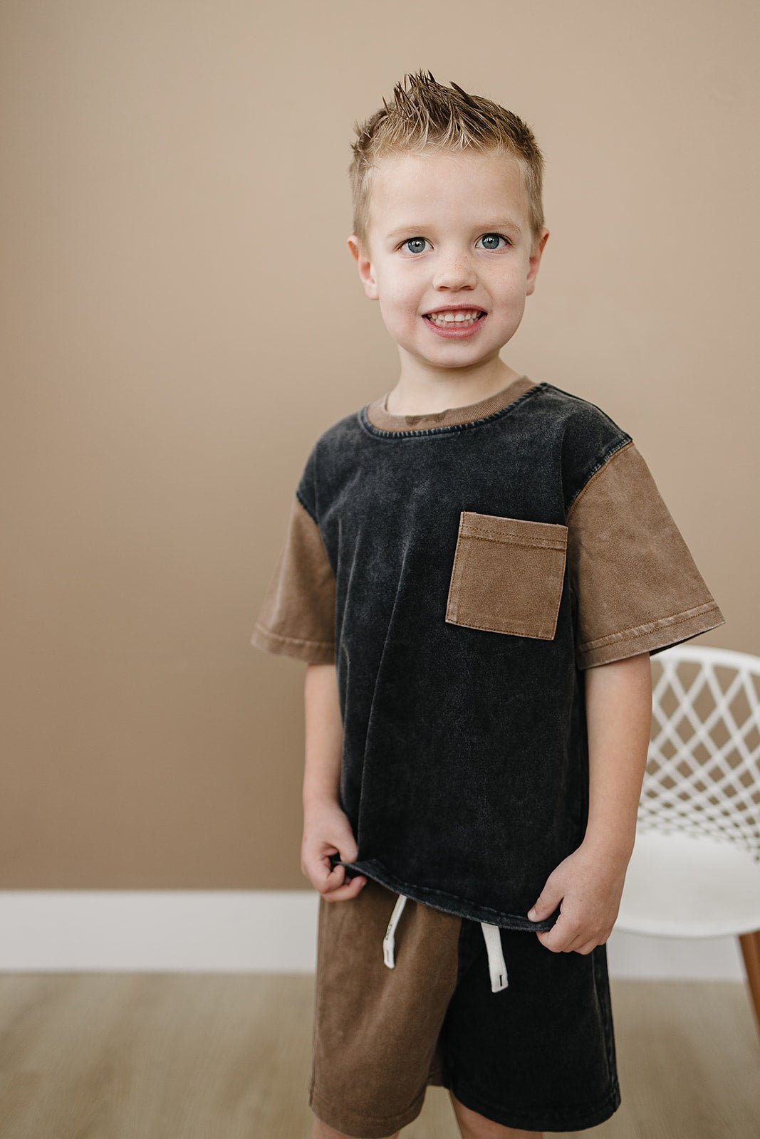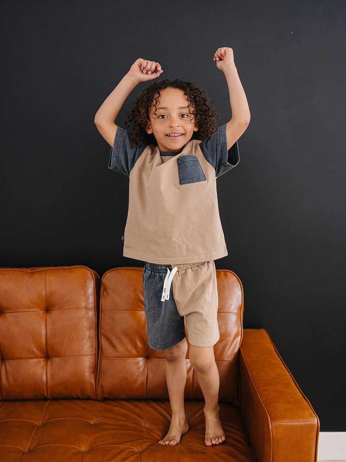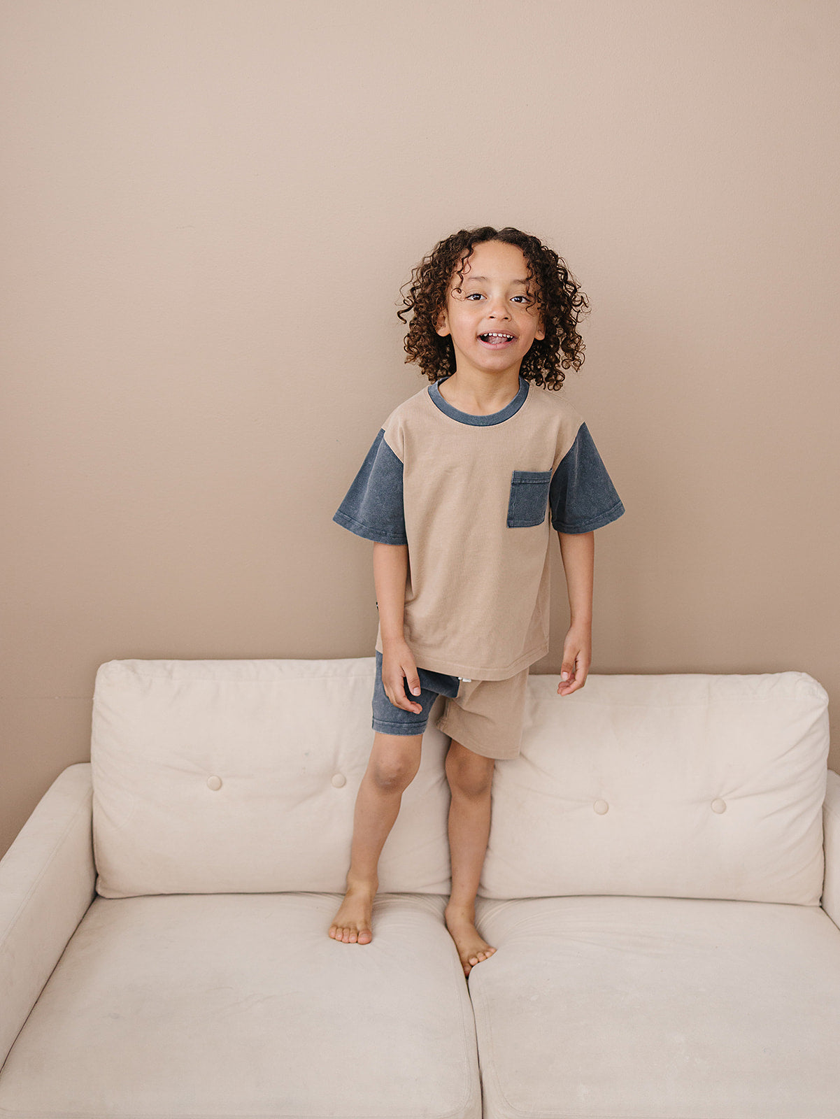 Introduce your little one to playful style with the Zoe Set, featuring a warm color block design that's sure to turn heads. The contrasting sleeves and pockets add visual interest, while the acid-washed finish gives it an effortlessly cool, lived-in vibe. Crafted from a soft cotton-spandex blend, this set features an elastic waistband and drawstring for a comfortable, adjustable fit that moves with active kids.