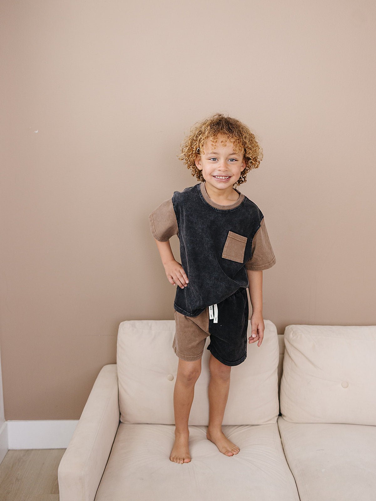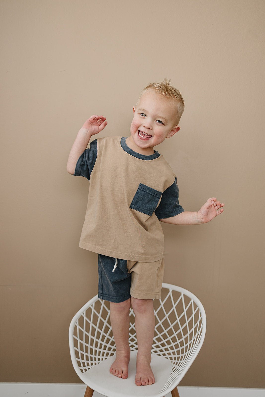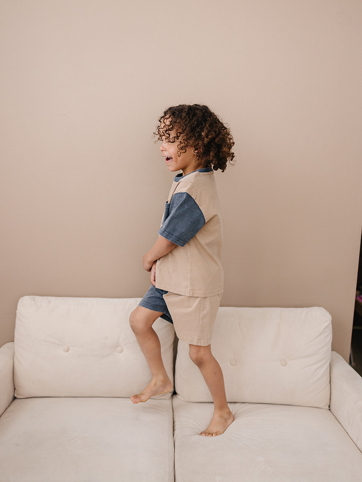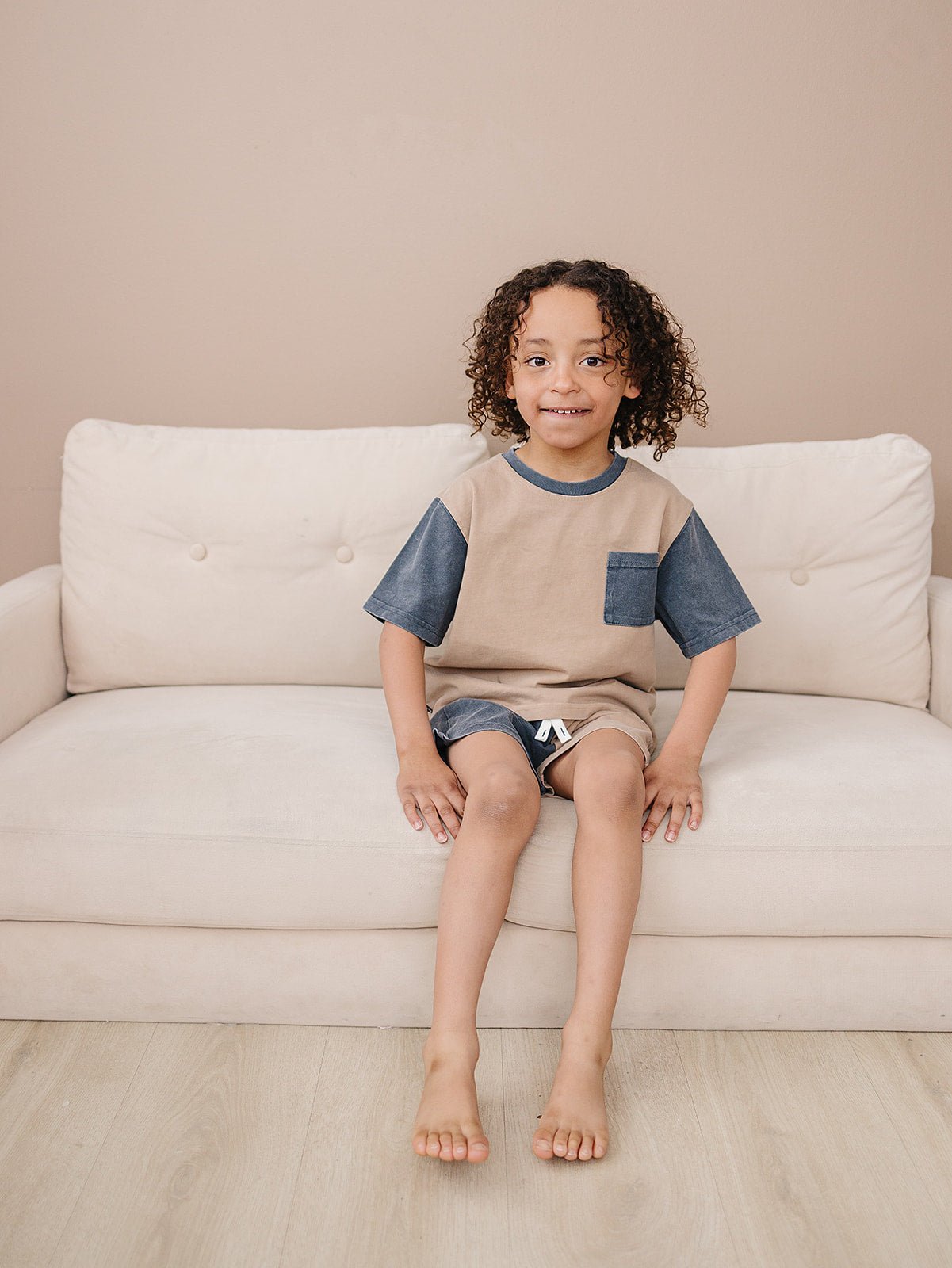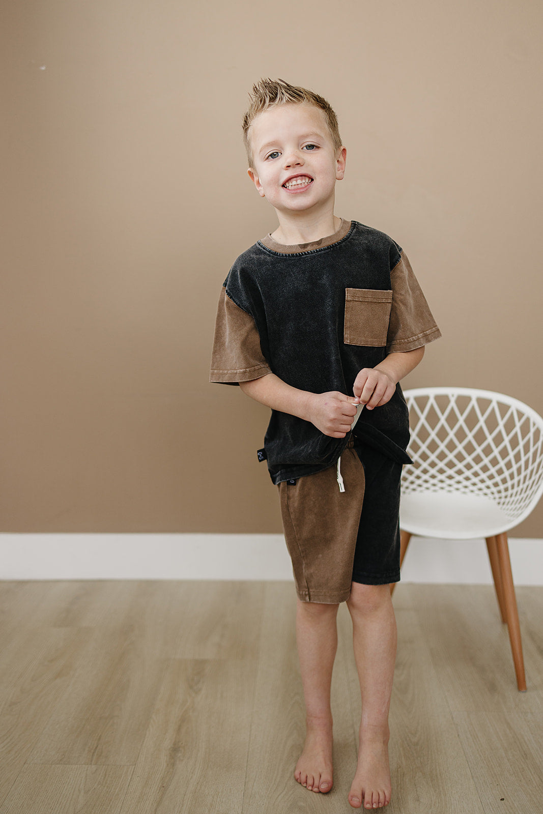 Introduce your little one to playful style with the Zoe Set, featuring a warm color block design that's sure to turn heads. The contrasting sleeves and pockets add visual interest, while the acid-washed finish gives it an effortlessly cool, lived-in vibe. Crafted from a soft cotton-spandex blend, this set features an elastic waistband and drawstring for a comfortable, adjustable fit that moves with active kids.