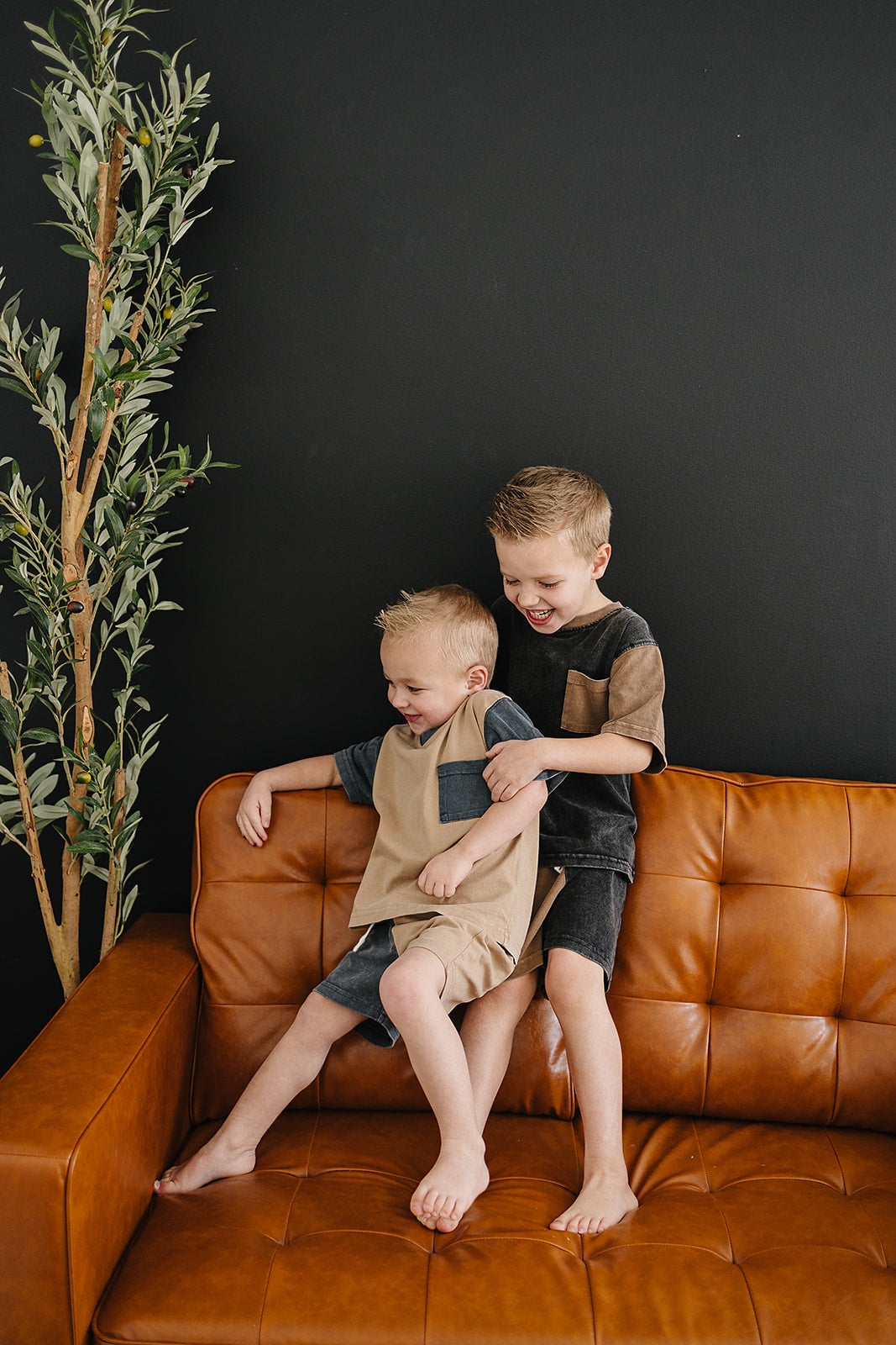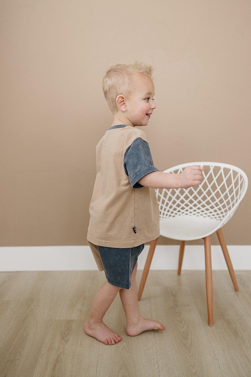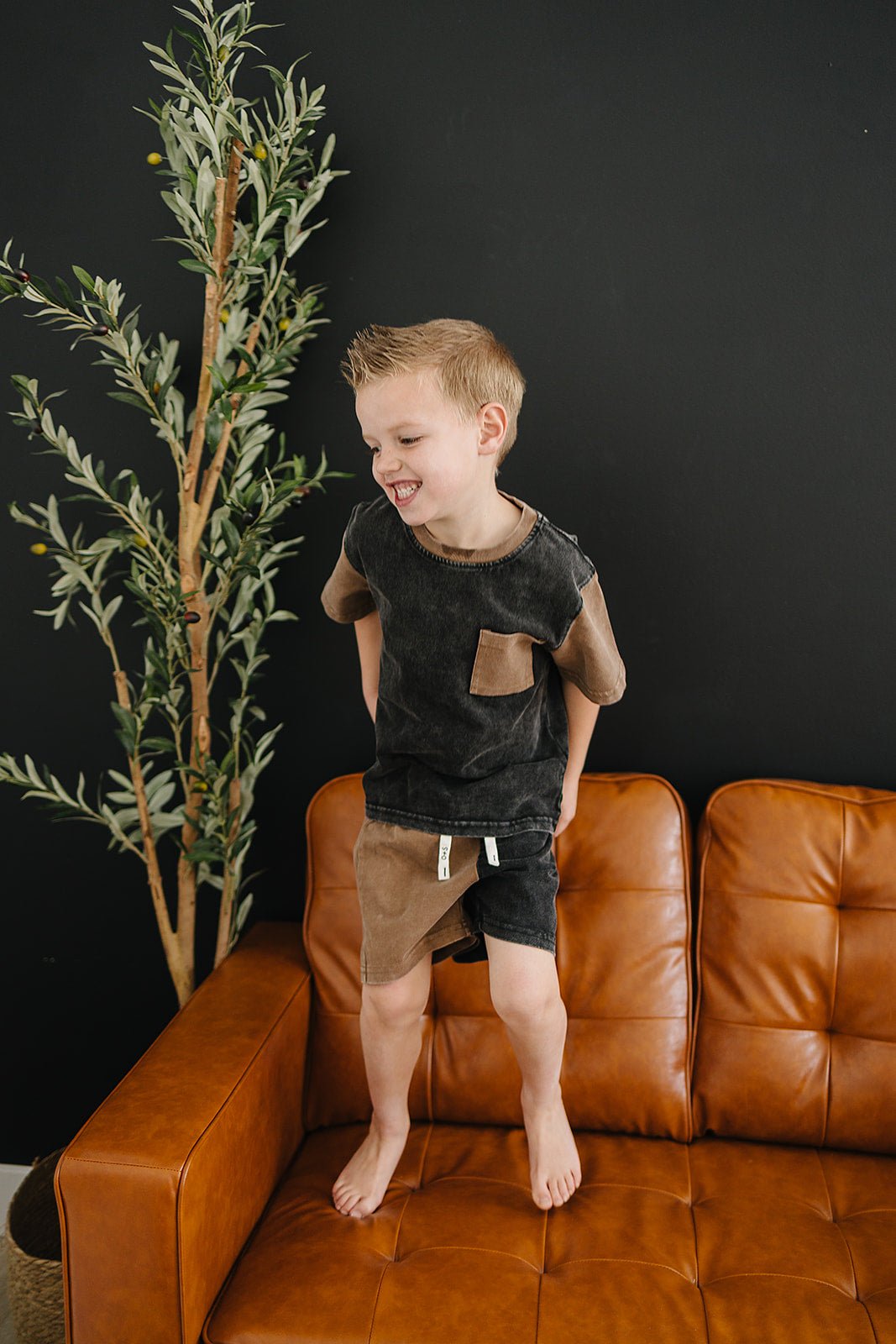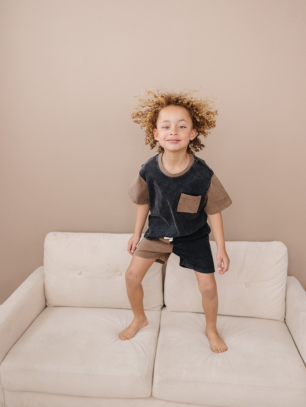 Introduce your little one to playful style with the Zoe Set, featuring a warm color block design that's sure to turn heads. The contrasting sleeves and pockets add visual interest, while the acid-washed finish gives it an effortlessly cool, lived-in vibe. Crafted from a soft cotton-spandex blend, this set features an elastic waistband and drawstring for a comfortable, adjustable fit that moves with active kids.